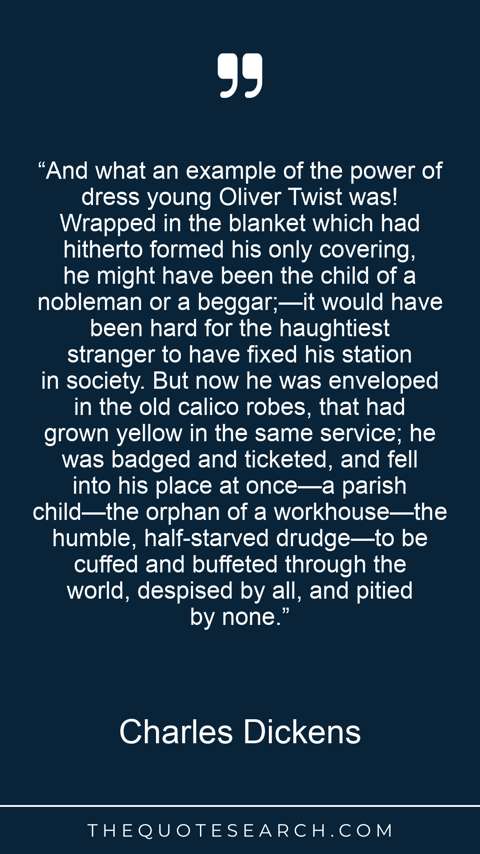 “And what an example of the power of dress young Oliver Twist was! Wrapped in the blanket which had hitherto formed his only covering, he might have been the child of a nobleman or a beggar;—it would have been hard for the haughtiest stranger to have fixed his station in society. But now he was enveloped in the old calico robes, that had grown yellow in the same service; he was badged and ticketed, and fell into his place at once—a parish child—the orphan of a workhouse—the humble, half-starved drudge—to be cuffed and buffeted through the world, despised by all, and pitied by none.”