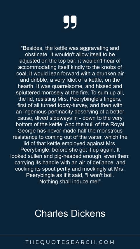 “Besides, the kettle was aggravating and obstinate. It wouldn't allow itself to be adjusted on the top bar; it wouldn't hear of accommodating itself kindly to the knobs of coal; it would lean forward with a drunken air and dribble, a very Idiot of a kettle, on the hearth. It was quarrelsome, and hissed and spluttered morosely at the fire. To sum up all, the lid, resisting Mrs. Peerybingle's fingers, first of all turned topsy-turvey, and then with an ingenious pertinacity deserving of a better cause, dived sideways in - down to the very bottom of the kettle. And the hull of the Royal George has never made half the monstrous resistance to coming out of the water, which the lid of that kettle employed against Mrs. Peerybingle, before she got it up again. It looked sullen and pig-headed enough, even then: carrying its handle with an air of defiance, and cocking its spout pertly and mockingly at Mrs. Peerybingle as if it said, "I won't boil. Nothing shall induce me!”