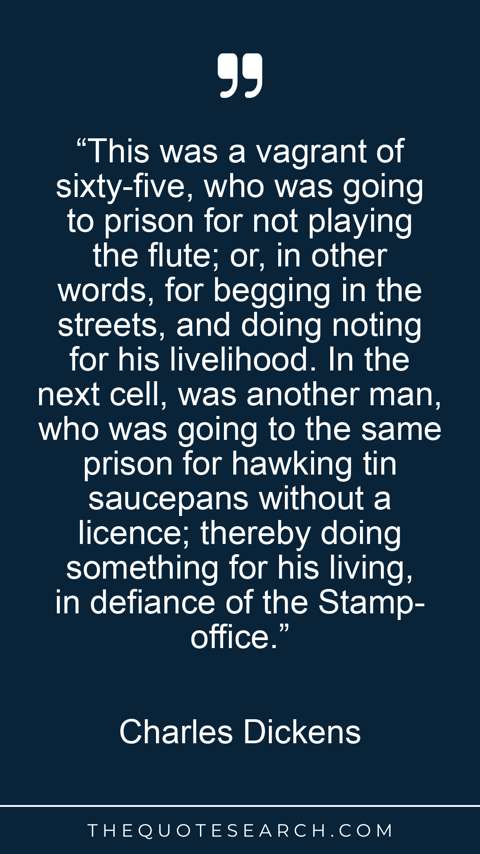 “This was a vagrant of sixty-five, who was going to prison for not playing the flute; or, in other words, for begging in the streets, and doing noting for his livelihood. In the next cell, was another man, who was going to the same prison for hawking tin saucepans without a licence; thereby doing something for his living, in defiance of the Stamp-office.”