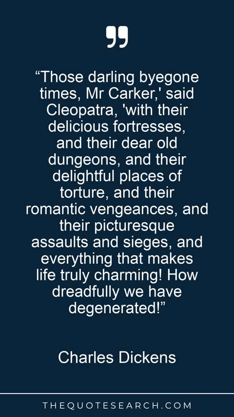“Those darling byegone times, Mr Carker,' said Cleopatra, 'with their delicious fortresses, and their dear old dungeons, and their delightful places of torture, and their romantic vengeances, and their picturesque assaults and sieges, and everything that makes life truly charming! How dreadfully we have degenerated!”