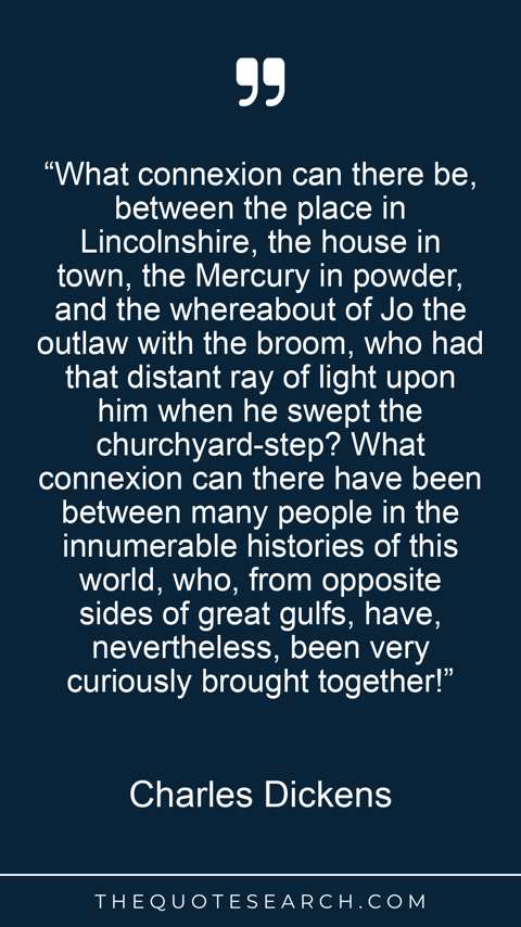 “What connexion can there be, between the place in Lincolnshire, the house in town, the Mercury in powder, and the whereabout of Jo the outlaw with the broom, who had that distant ray of light upon him when he swept the churchyard-step? What connexion can there have been between many people in the innumerable histories of this world, who, from opposite sides of great gulfs, have, nevertheless, been very curiously brought together!”