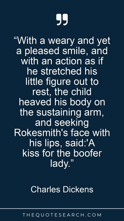 “With a weary and yet a pleased smile, and with an action as if he stretched his little figure out to rest, the child heaved his body on the sustaining arm, and seeking Rokesmith's face with his lips, said:'A kiss for the boofer lady.”