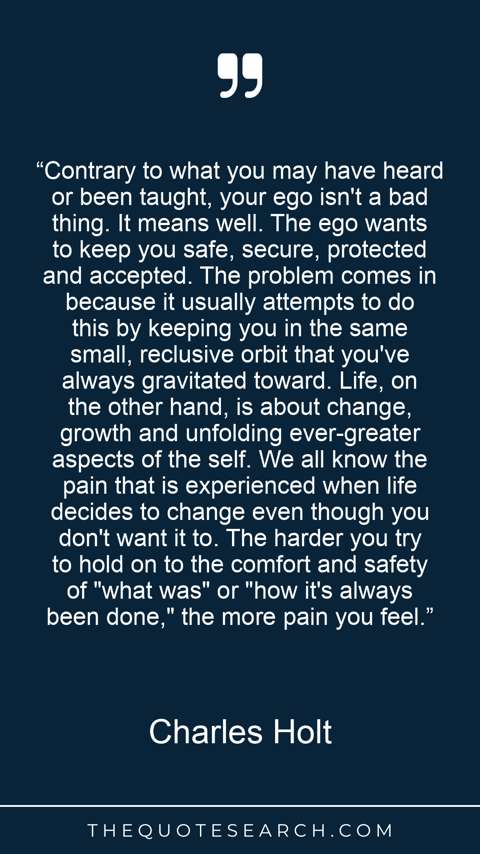 “Contrary to what you may have heard or been taught, your ego isn't a bad thing. It means well. The ego wants to keep you safe, secure, protected and accepted. The problem comes in because it usually attempts to do this by keeping you in the same small, reclusive orbit that you've always gravitated toward. Life, on the other hand, is about change, growth and unfolding ever-greater aspects of the self. We all know the pain that is experienced when life decides to change even though you don't want it to. The harder you try to hold on to the comfort and safety of "what was" or "how it's always been done," the more pain you feel.”