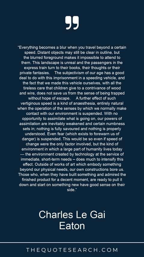 “Everything becomes a blur when you travel beyond a certain speed. Distant objects may still be clear in outline, but the blurred foreground makes it impossible to attend to them. This landscape is unreal and the passengers in the express train turn to their books, their thoughts or their private fantasies. The subjectivism of our age has a good deal to do with this imprisonment in a speeding vehicle, and the fact that we made this vehicle ourselves, with all the tireless care that children give to a contrivance of wood and wire, does not save us from the sense of being trapped without hope of escape. A further effect of such vertiginous speed is a kind of anaesthesia, entirely natural when the operation of the senses by which we normally make contact with our environment is suspended. With no opportunity to assimilate what is going on, our powers of assimilation are inevitably weakened and certain numbness sets in; nothing is fully savoured and nothing is properly understood. Even fear (which exists to forewarn us of danger) is suspended. This would be so even if speed of change were the only factor involved, but the kind of environment in which a large part of humanity lives today --- the environment created by technology at the service of immediate, short-term needs – does much to intensify this effect. Outside of works of art which embody something beyond our physical needs, our own constructions bore us. Those who, when they have built something and admired the finished product for a decent moment, are ready to pull it down and start on something new have good sense on their side.”