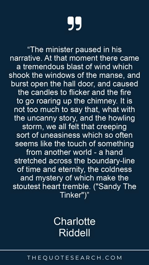 “The minister paused in his narrative. At that moment there came a tremendous blast of wind which shook the windows of the manse, and burst open the hall door, and caused the candles to flicker and the fire to go roaring up the chimney. It is not too much to say that, what with the uncanny story, and the howling storm, we all felt that creeping sort of uneasiness which so often seems like the touch of something from another world - a hand stretched across the boundary-line of time and eternity, the coldness and mystery of which make the stoutest heart tremble. ("Sandy The Tinker")”