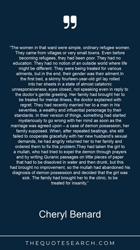 “The women in that ward were simple, ordinary refugee women. They came from villages or very small towns. Even before becoming refugees, they had been poor. They had no education. They had no notion of an outside world where life might be different. They were being treated for various ailments, but in the end, their gender was their ailment.In the first bed, a skinny fourteen-year-old girl lay rolled into her sheets in a state of almost catatonic unresponsiveness, eyes closed, not speaking even in reply to the doctor’s gentle greeting. Her family had brought her to be treated for mental illness, the doctor explained with regret. They had recently married her to a man in his seventies, a wealthy and influential personage by their standards. In their version of things, something had started mysteriously to go wrong with her mind as soon as the marriage was agreed upon – a case of demon possession, her family supposed. When, after repeated beatings, she still failed to cooperate gracefully with her new husband’s sexual demands, he had angrily returned her to her family and ordered them to fix this problem.They had taken the girl to a mullah, who had tried to expel the demon through prayers and by writing Quranic passages on little pieces of paper that had to be dissolved in water and then drunk, but this had brought no improvement, so the mullah had abandoned his diagnosis of demon possession and decided that the girl was sick. The family had brought her to the clinic, to be treated for insanity.”