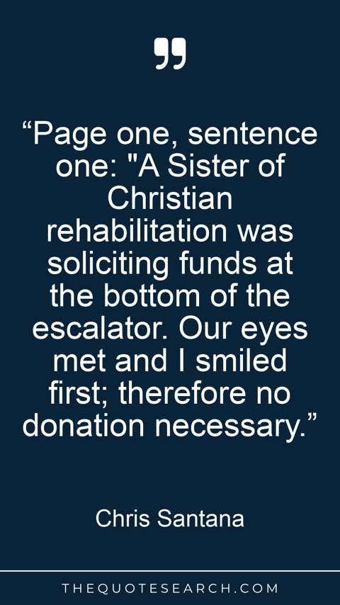 “Page one, sentence one: "A Sister of Christian rehabilitation was soliciting funds at the bottom of the escalator. Our eyes met and I smiled first; therefore no donation necessary.”