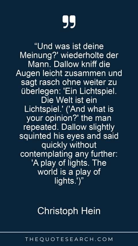 “Und was ist deine Meinung?' wiederholte der Mann. Dallow kniff die Augen leicht zusammen und sagt rasch ohne weiter zu überlegen: 'Ein Lichtspiel. Die Welt ist ein Lichtspiel.' ('And what is your opinion?' the man repeated. Dallow slightly squinted his eyes and said quickly without contemplating any further: 'A play of lights. The world is a play of lights.')”