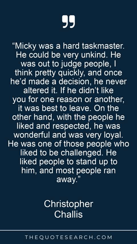 “Micky was a hard taskmaster. He could be very unkind. He was out to judge people, I think pretty quickly, and once he’d made a decision, he never altered it. If he didn’t like you for one reason or another, it was best to leave. On the other hand, with the people he liked and respected, he was wonderful and was very loyal. He was one of those people who liked to be challenged. He liked people to stand up to him, and most people ran away.”
