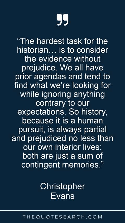 “The hardest task for the historian… is to consider the evidence without prejudice. We all have prior agendas and tend to find what we’re looking for while ignoring anything contrary to our expectations. So history, because it is a human pursuit, is always partial and prejudiced no less than our own interior lives: both are just a sum of contingent memories.”