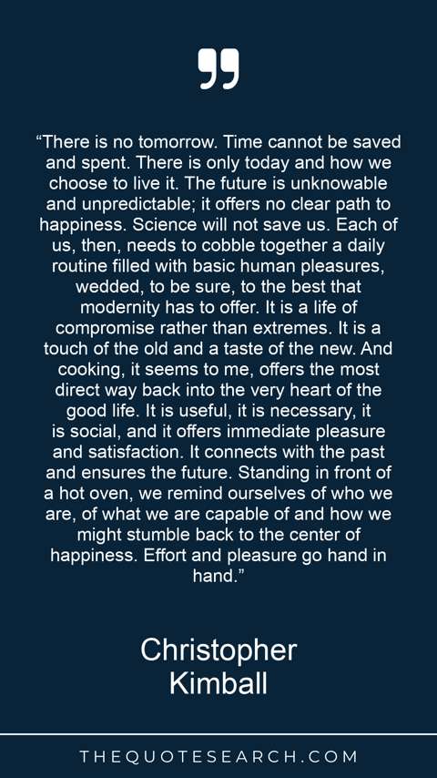 “There is no tomorrow. Time cannot be saved and spent. There is only today and how we choose to live it. The future is unknowable and unpredictable; it offers no clear path to happiness. Science will not save us. Each of us, then, needs to cobble together a daily routine filled with basic human pleasures, wedded, to be sure, to the best that modernity has to offer. It is a life of compromise rather than extremes. It is a touch of the old and a taste of the new. And cooking, it seems to me, offers the most direct way back into the very heart of the good life. It is useful, it is necessary, it is social, and it offers immediate pleasure and satisfaction. It connects with the past and ensures the future. Standing in front of a hot oven, we remind ourselves of who we are, of what we are capable of and how we might stumble back to the center of happiness. Effort and pleasure go hand in hand.”