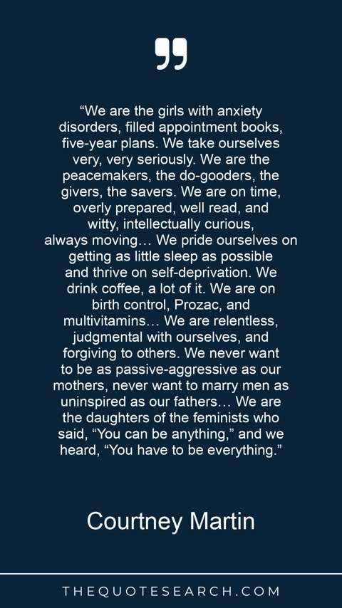 “We are the girls with anxiety disorders, filled appointment books, five-year plans. We take ourselves very, very seriously. We are the peacemakers, the do-gooders, the givers, the savers. We are on time, overly prepared, well read, and witty, intellectually curious, always moving… We pride ourselves on getting as little sleep as possible and thrive on self-deprivation. We drink coffee, a lot of it. We are on birth control, Prozac, and multivitamins… We are relentless, judgmental with ourselves, and forgiving to others. We never want to be as passive-aggressive as our mothers, never want to marry men as uninspired as our fathers… We are the daughters of the feminists who said, “You can be anything,” and we heard, “You have to be everything.”