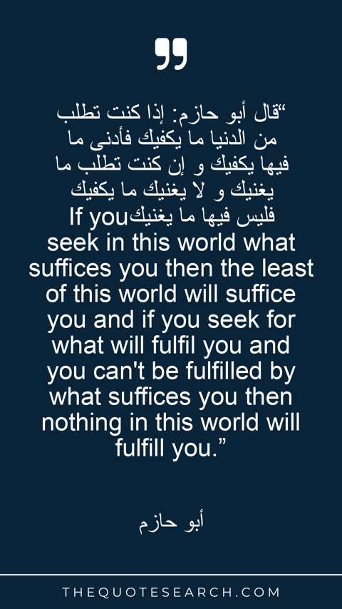 “قال أبو حازم: إذا كنت تطلب من الدنيا ما يكفيك فأدنى ما فيها يكفيك و إن كنت تطلب ما يغنيك و لا يغنيك ما يكفيك فليس فيها ما يغنيكIf you seek in this world what suffices you then the least of this world will suffice you and if you seek for what will fulfil you and you can't be fulfilled by what suffices you then nothing in this world will fulfill you.”