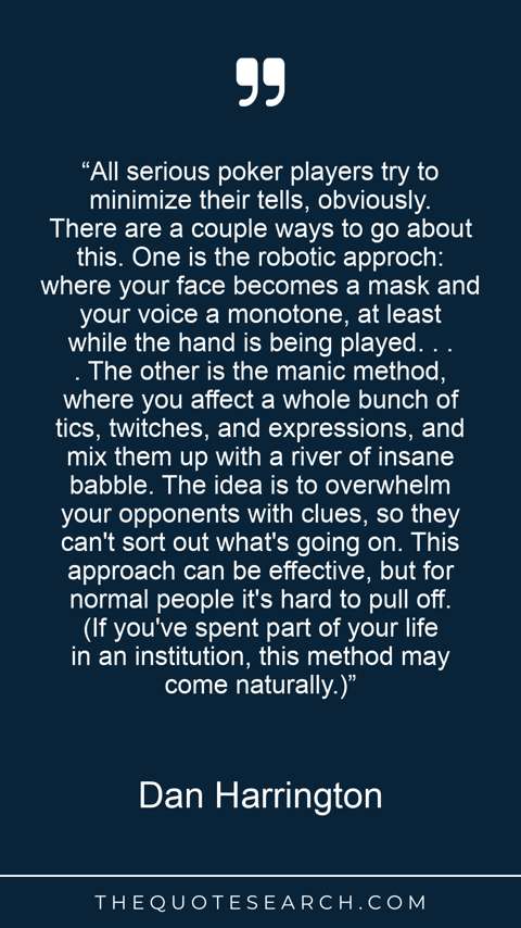 “All serious poker players try to minimize their tells, obviously. There are a couple ways to go about this. One is the robotic approch: where your face becomes a mask and your voice a monotone, at least while the hand is being played. . . . The other is the manic method, where you affect a whole bunch of tics, twitches, and expressions, and mix them up with a river of insane babble. The idea is to overwhelm your opponents with clues, so they can't sort out what's going on. This approach can be effective, but for normal people it's hard to pull off. (If you've spent part of your life in an institution, this method may come naturally.)”