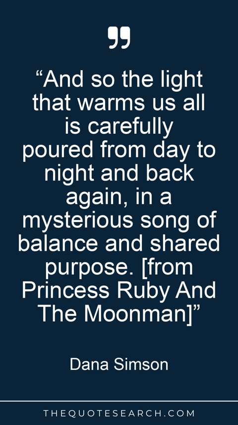 “And so the light that warms us all is carefully poured from day to night and back again, in a mysterious song of balance and shared purpose. [from Princess Ruby And The Moonman]”