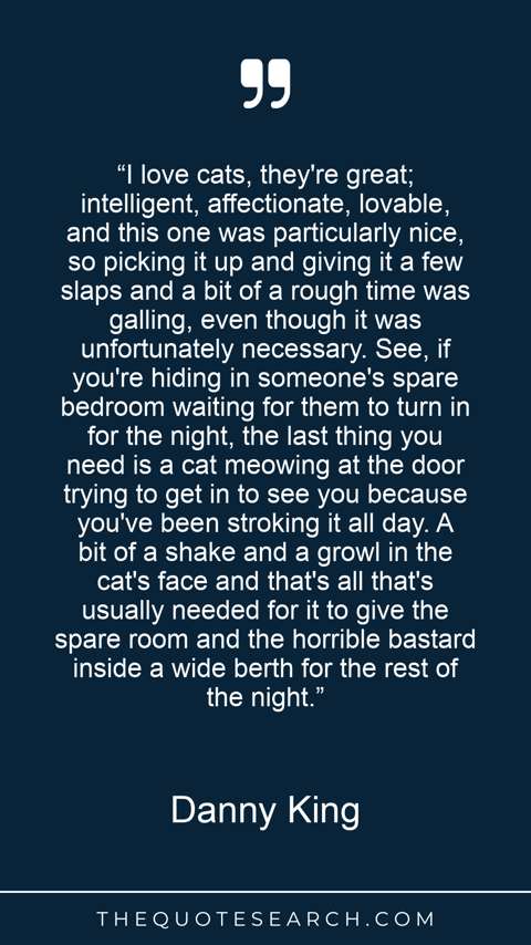 “I love cats, they're great; intelligent, affectionate, lovable, and this one was particularly nice, so picking it up and giving it a few slaps and a bit of a rough time was galling, even though it was unfortunately necessary. See, if you're hiding in someone's spare bedroom waiting for them to turn in for the night, the last thing you need is a cat meowing at the door trying to get in to see you because you've been stroking it all day. A bit of a shake and a growl in the cat's face and that's all that's usually needed for it to give the spare room and the horrible bastard inside a wide berth for the rest of the night.”