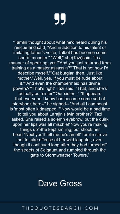 “Tamlin thought about what he'd heard during his rescue and said, "And in addition to his talent of imitating father's voice, Talbot has become some sort of monster." "Well," she(Tazi)said. "In a manner of speaking, yes""And you just returned from training as a master assassin?""That is not how I'd describe myself.""Cat burglar, then. Just like mother."Well, yes. If you must be rude about it.""And even the chambermaid has divine powers?""That's right" Tazi said. "That, and she's actually our sister""Our sister..." "It appears that everyone I know has become some sort of storybook hero--" he sighed-- "And all I can boast is 'most often kidnapped.'""Now would be a bad time to tell you about Larajin's twin brother?" Tazi asked. She raised a solemn eyebrow, but the quirk upon her lips was all mischief"Now you're making things up"She kept smiling, but shook her head."Next you'll tell me he's an elf"Tamlin strove not to take offense at her wild laughter, even though it continued long after they had turned off the streets of Selgaunt and rumbled through the gate to Stormweather Towers.”