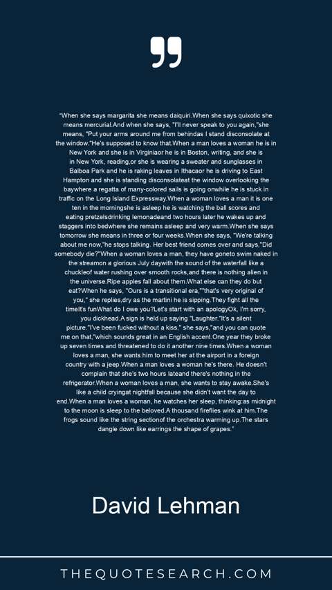 “When she says margarita she means daiquiri.When she says quixotic she means mercurial.And when she says, "I'll never speak to you again,"she means, "Put your arms around me from behindas I stand disconsolate at the window."He's supposed to know that.When a man loves a woman he is in New York and she is in Virginiaor he is in Boston, writing, and she is in New York, reading,or she is wearing a sweater and sunglasses in Balboa Park and he is raking leaves in Ithacaor he is driving to East Hampton and she is standing disconsolateat the window overlooking the baywhere a regatta of many-colored sails is going onwhile he is stuck in traffic on the Long Island Expressway.When a woman loves a man it is one ten in the morningshe is asleep he is watching the ball scores and eating pretzelsdrinking lemonadeand two hours later he wakes up and staggers into bedwhere she remains asleep and very warm.When she says tomorrow she means in three or four weeks.When she says, "We're talking about me now,"he stops talking. Her best friend comes over and says,"Did somebody die?"When a woman loves a man, they have goneto swim naked in the streamon a glorious July daywith the sound of the waterfall like a chuckleof water rushing over smooth rocks,and there is nothing alien in the universe.Ripe apples fall about them.What else can they do but eat?When he says, "Ours is a transitional era,""that's very original of you," she replies,dry as the martini he is sipping.They fight all the timeIt's funWhat do I owe you?Let's start with an apologyOk, I'm sorry, you dickhead.A sign is held up saying "Laughter."It's a silent picture."I've been fucked without a kiss," she says,"and you can quote me on that,"which sounds great in an English accent.One year they broke up seven times and threatened to do it another nine times.When a woman loves a man, she wants him to meet her at the airport in a foreign country with a jeep.When a man loves a woman he's there. He doesn't complain that she's two hours lateand there's nothing in the refrigerator.When a woman loves a man, she wants to stay awake.She's like a child cryingat nightfall because she didn't want the day to end.When a man loves a woman, he watches her sleep, thinking:as midnight to the moon is sleep to the beloved.A thousand fireflies wink at him.The frogs sound like the string sectionof the orchestra warming up.The stars dangle down like earrings the shape of grapes.”