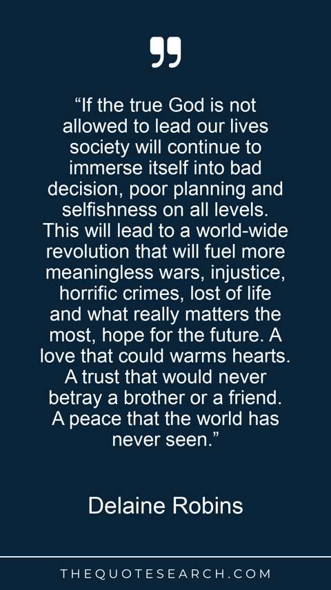 “If the true God is not allowed to lead our lives society will continue to immerse itself into bad decision, poor planning and selfishness on all levels. This will lead to a world-wide revolution that will fuel more meaningless wars, injustice, horrific crimes, lost of life and what really matters the most, hope for the future. A love that could warms hearts. A trust that would never betray a brother or a friend. A peace that the world has never seen.”