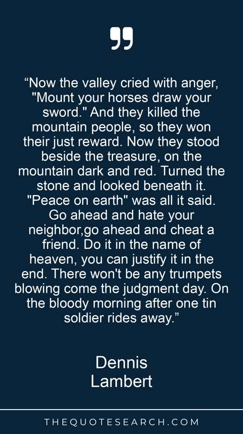 “Now the valley cried with anger, "Mount your horses draw your sword." And they killed the mountain people, so they won their just reward. Now they stood beside the treasure, on the mountain dark and red. Turned the stone and looked beneath it. "Peace on earth" was all it said. Go ahead and hate your neighbor,go ahead and cheat a friend. Do it in the name of heaven, you can justify it in the end. There won't be any trumpets blowing come the judgment day. On the bloody morning after one tin soldier rides away.”