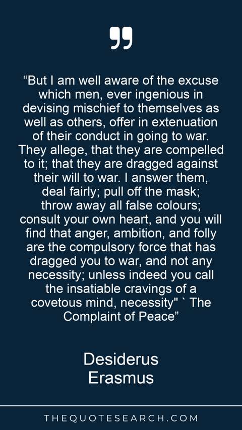 “But I am well aware of the excuse which men, ever ingenious in devising mischief to themselves as well as others, offer in extenuation of their conduct in going to war. They allege, that they are compelled to it; that they are dragged against their will to war. I answer them, deal fairly; pull off the mask; throw away all false colours; consult your own heart, and you will find that anger, ambition, and folly are the compulsory force that has dragged you to war, and not any necessity; unless indeed you call the insatiable cravings of a covetous mind, necessity" ` The Complaint of Peace”
