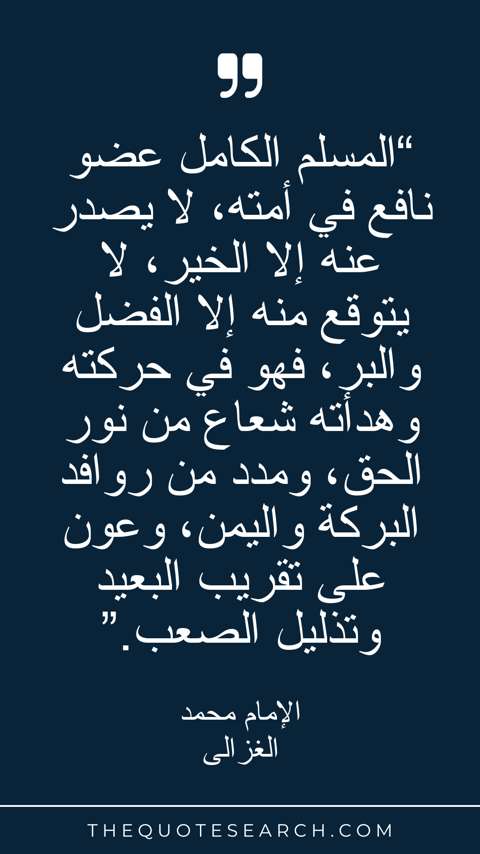 “المسلم الكامل عضو نافع في أمته، لا يصدر عنه إلا الخير، لا يتوقع منه إلا الفضل والبر، فهو في حركته وهدأته شعاع من نور الحق، ومدد من روافد البركة واليمن، وعون على تقريب البعيد وتذليل الصعب.”