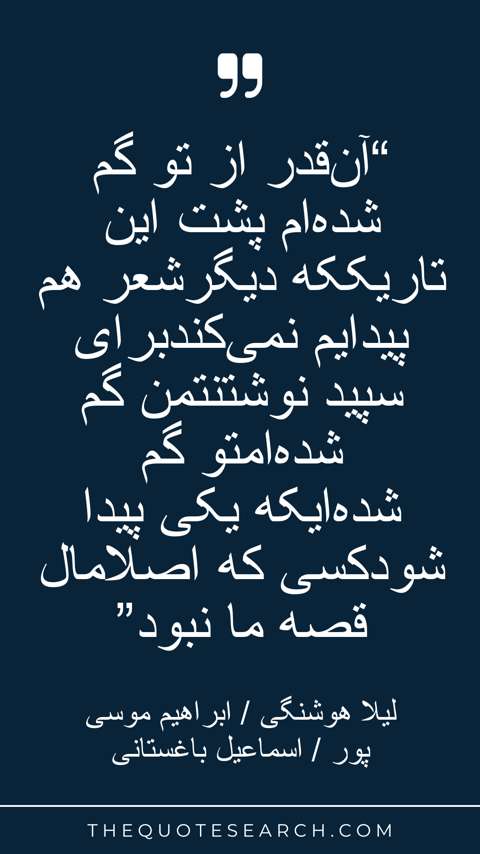 “آنقدر از تو گم شدهام پشت این تاریککه دیگرشعر هم پیدایم نمیکندبرای سپید نوشتنتمن گم شدهامتو گم شدهایکه یکی پیدا شودکسی که اصلامال قصه ما نبود”