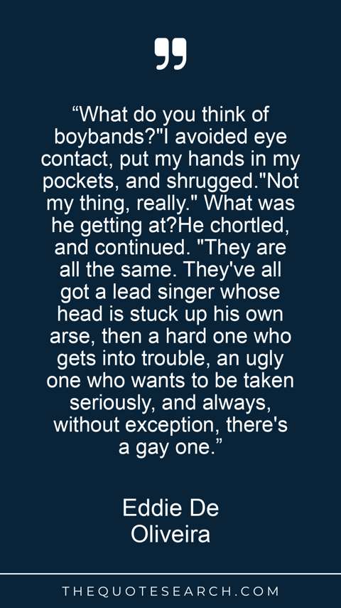 “What do you think of boybands?"I avoided eye contact, put my hands in my pockets, and shrugged."Not my thing, really." What was he getting at?He chortled, and continued. "They are all the same. They've all got a lead singer whose head is stuck up his own arse, then a hard one who gets into trouble, an ugly one who wants to be taken seriously, and always, without exception, there's a gay one.”