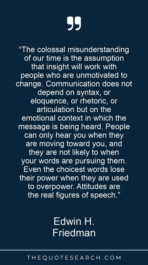 “The colossal misunderstanding of our time is the assumption that insight will work with people who are unmotivated to change. Communication does not depend on syntax, or eloquence, or rhetoric, or articulation but on the emotional context in which the message is being heard. People can only hear you when they are moving toward you, and they are not likely to when your words are pursuing them. Even the choicest words lose their power when they are used to overpower. Attitudes are the real figures of speech.”