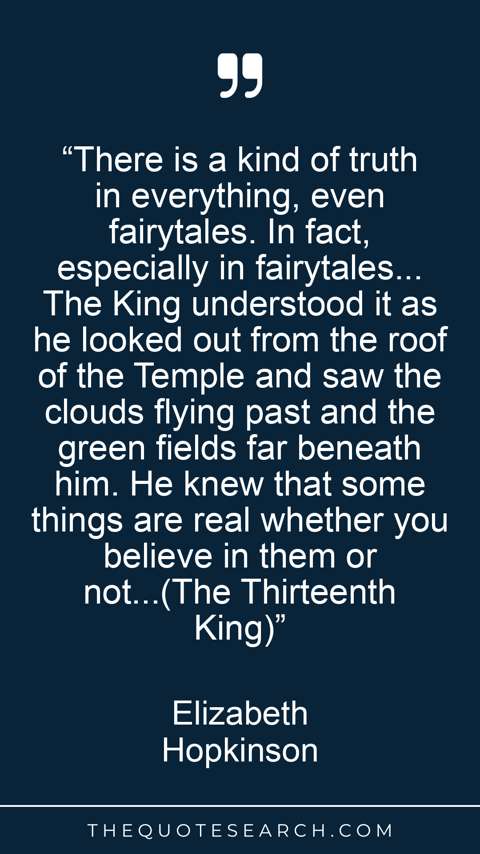 “There is a kind of truth in everything, even fairytales. In fact, especially in fairytales... The King understood it as he looked out from the roof of the Temple and saw the clouds flying past and the green fields far beneath him. He knew that some things are real whether you believe in them or not...(The Thirteenth King)”