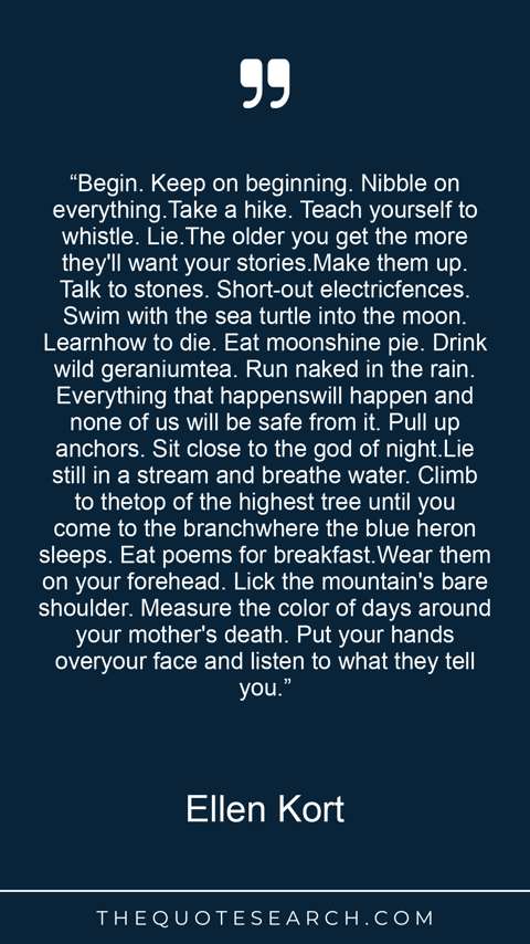 “Begin. Keep on beginning. Nibble on everything.Take a hike. Teach yourself to whistle. Lie.The older you get the more they'll want your stories.Make them up. Talk to stones. Short-out electricfences. Swim with the sea turtle into the moon. Learnhow to die. Eat moonshine pie. Drink wild geraniumtea. Run naked in the rain. Everything that happenswill happen and none of us will be safe from it. Pull up anchors. Sit close to the god of night.Lie still in a stream and breathe water. Climb to thetop of the highest tree until you come to the branchwhere the blue heron sleeps. Eat poems for breakfast.Wear them on your forehead. Lick the mountain's bare shoulder. Measure the color of days around your mother's death. Put your hands overyour face and listen to what they tell you.”
