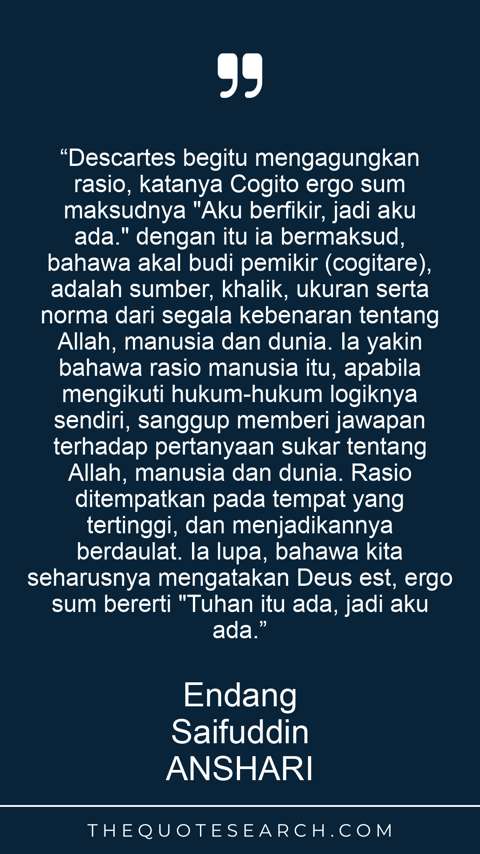 “Descartes begitu mengagungkan rasio, katanya Cogito ergo sum maksudnya "Aku berfikir, jadi aku ada." dengan itu ia bermaksud, bahawa akal budi pemikir (cogitare), adalah sumber, khalik, ukuran serta norma dari segala kebenaran tentang Allah, manusia dan dunia. Ia yakin bahawa rasio manusia itu, apabila mengikuti hukum-hukum logiknya sendiri, sanggup memberi jawapan terhadap pertanyaan sukar tentang Allah, manusia dan dunia. Rasio ditempatkan pada tempat yang tertinggi, dan menjadikannya berdaulat. Ia lupa, bahawa kita seharusnya mengatakan Deus est, ergo sum bererti "Tuhan itu ada, jadi aku ada.”