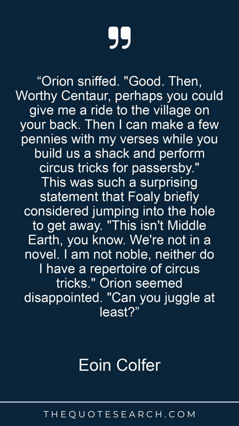 “Orion sniffed. "Good. Then, Worthy Centaur, perhaps you could give me a ride to the village on your back. Then I can make a few pennies with my verses while you build us a shack and perform circus tricks for passersby." This was such a surprising statement that Foaly briefly considered jumping into the hole to get away. "This isn't Middle Earth, you know. We're not in a novel. I am not noble, neither do I have a repertoire of circus tricks." Orion seemed disappointed. "Can you juggle at least?”