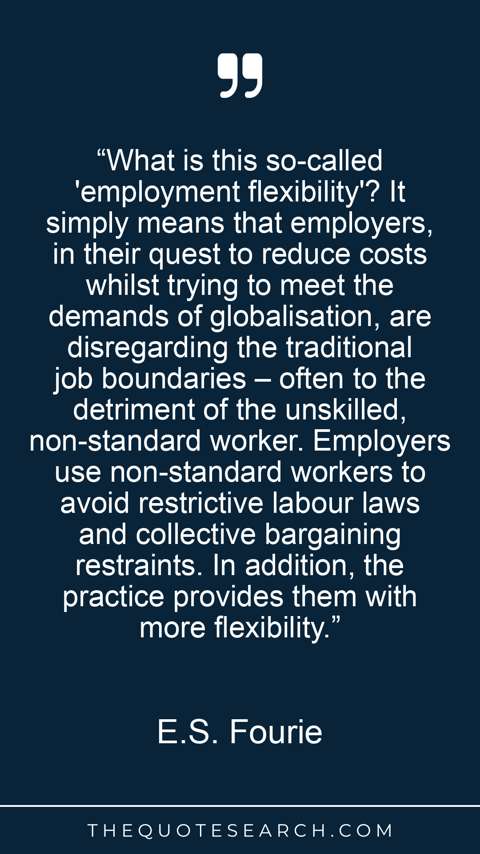 “What is this so-called 'employment flexibility'? It simply means that employers, in their quest to reduce costs whilst trying to meet the demands of globalisation, are disregarding the traditional job boundaries – often to the detriment of the unskilled, non-standard worker. Employers use non-standard workers to avoid restrictive labour laws and collective bargaining restraints. In addition, the practice provides them with more flexibility.”