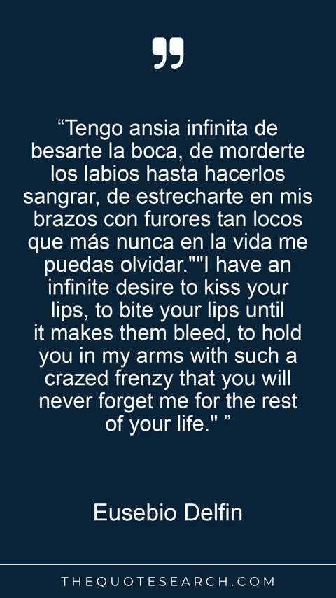 “Tengo ansia infinita de besarte la boca, de morderte los labios hasta hacerlos sangrar, de estrecharte en mis brazos con furores tan locos que más nunca en la vida me puedas olvidar.""I have an infinite desire to kiss your lips, to bite your lips until it makes them bleed, to hold you in my arms with such a crazed frenzy that you will never forget me for the rest of your life." ”
