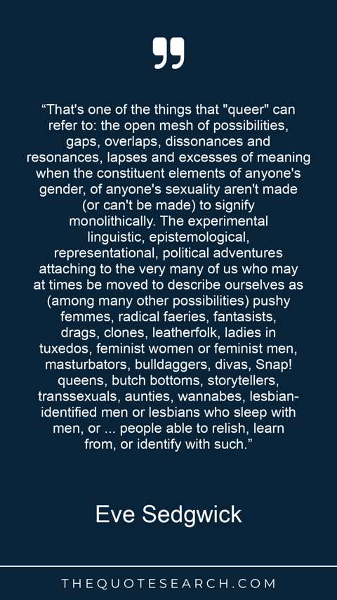 “That's one of the things that "queer" can refer to: the open mesh of possibilities, gaps, overlaps, dissonances and resonances, lapses and excesses of meaning when the constituent elements of anyone's gender, of anyone's sexuality aren't made (or can't be made) to signify monolithically. The experimental linguistic, epistemological, representational, political adventures attaching to the very many of us who may at times be moved to describe ourselves as (among many other possibilities) pushy femmes, radical faeries, fantasists, drags, clones, leatherfolk, ladies in tuxedos, feminist women or feminist men, masturbators, bulldaggers, divas, Snap! queens, butch bottoms, storytellers, transsexuals, aunties, wannabes, lesbian-identified men or lesbians who sleep with men, or ... people able to relish, learn from, or identify with such.”