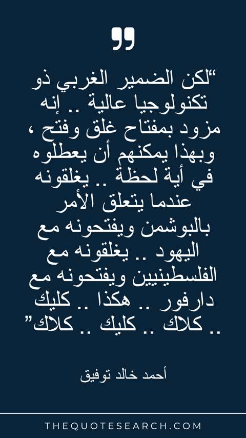 “لكن الضمير الغربي ذو تكنولوجيا عالية .. إنه مزود بمفتاح غلق وفتح ، وبهذا يمكنهم أن يعطلوه في أية لحظة .. يغلقونه عندما يتعلق الأمر بالبوشمن ويفتحونه مع اليهود .. يغلقونه مع الفلسطينيين ويفتحونه مع دارفور .. هكذا .. كليك .. كلاك .. كليك .. كلاك”