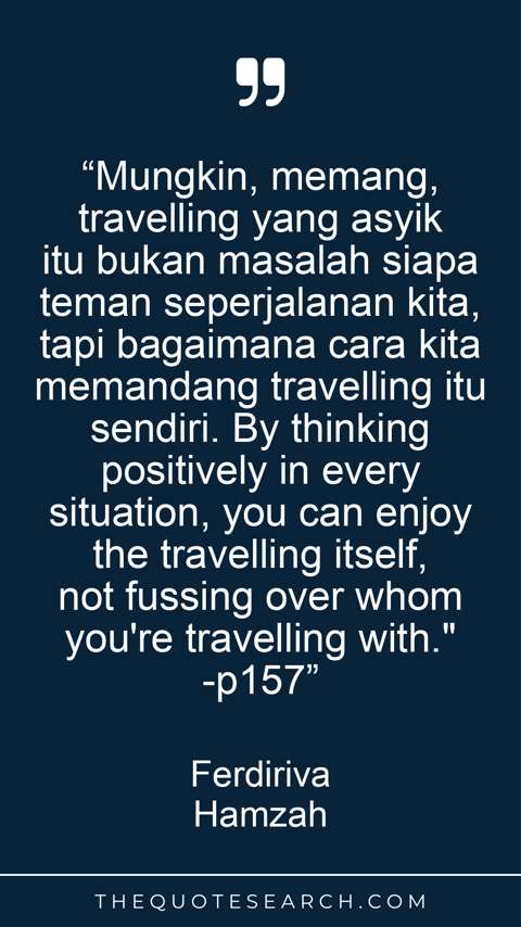 “Mungkin, memang, travelling yang asyik itu bukan masalah siapa teman seperjalanan kita, tapi bagaimana cara kita memandang travelling itu sendiri. By thinking positively in every situation, you can enjoy the travelling itself, not fussing over whom you're travelling with." -p157”