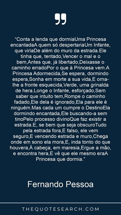 “Conta a lenda que dormiaUma Princesa encantadaA quem só despertariaUm Infante, que viriaDe além do muro da estrada.Ele tinha que, tentado,Vencer o mal e o bem,Antes que, já libertado,Deixasse o caminho erradoPor o que à Princesa vem.A Princesa Adormecida,Se espera, dormindo espera,Sonha em morte a sua vida,E orna-lhe a fronte esquecida,Verde, uma grinalda de hera.Longe o Infante, esforçado,Sem saber que intuito tem,Rompe o caminho fadado,Ele dela é ignorado,Ela para ele é ninguém.Mas cada um cumpre o DestinoEla dormindo encantada,Ele buscando-a sem tinoPelo processo divinoQue faz existir a estrada.E, se bem que seja obscuroTudo pela estrada fora,E falso, ele vem seguro,E vencendo estrada e muro,Chega onde em sono ela mora,E, inda tonto do que houvera,À cabeça, em maresia,Ergue a mão, e encontra hera,E vê que ele mesmo eraA Princesa que dormia.”