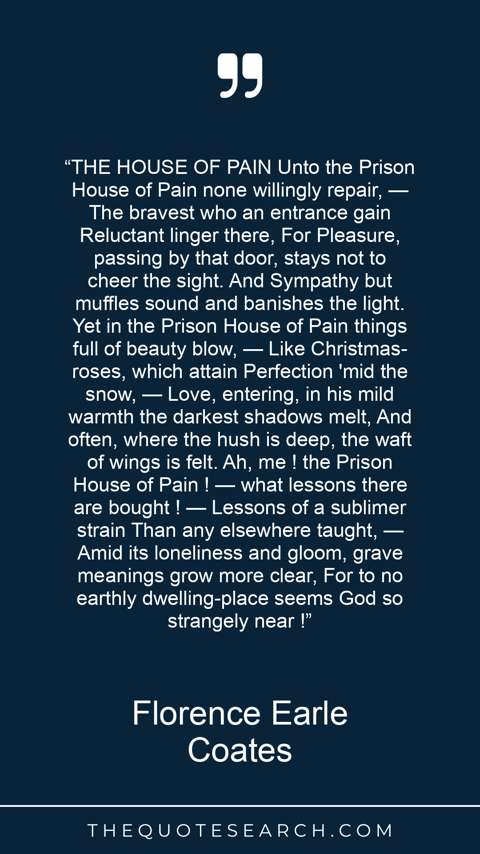 “THE HOUSE OF PAIN Unto the Prison House of Pain none willingly repair, — The bravest who an entrance gain Reluctant linger there, For Pleasure, passing by that door, stays not to cheer the sight. And Sympathy but muffles sound and banishes the light. Yet in the Prison House of Pain things full of beauty blow, — Like Christmas-roses, which attain Perfection 'mid the snow, — Love, entering, in his mild warmth the darkest shadows melt, And often, where the hush is deep, the waft of wings is felt. Ah, me ! the Prison House of Pain ! — what lessons there are bought ! — Lessons of a sublimer strain Than any elsewhere taught, — Amid its loneliness and gloom, grave meanings grow more clear, For to no earthly dwelling-place seems God so strangely near !”