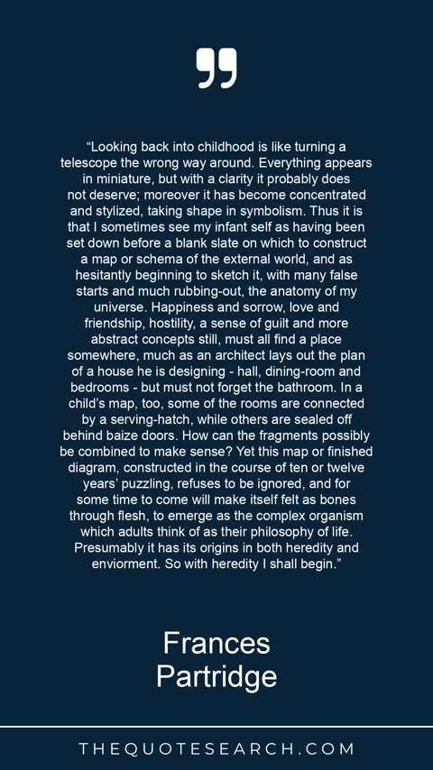 “Looking back into childhood is like turning a telescope the wrong way around. Everything appears in miniature, but with a clarity it probably does not deserve; moreover it has become concentrated and stylized, taking shape in symbolism. Thus it is that I sometimes see my infant self as having been set down before a blank slate on which to construct a map or schema of the external world, and as hesitantly beginning to sketch it, with many false starts and much rubbing-out, the anatomy of my universe. Happiness and sorrow, love and friendship, hostility, a sense of guilt and more abstract concepts still, must all find a place somewhere, much as an architect lays out the plan of a house he is designing - hall, dining-room and bedrooms - but must not forget the bathroom. In a child’s map, too, some of the rooms are connected by a serving-hatch, while others are sealed off behind baize doors. How can the fragments possibly be combined to make sense? Yet this map or finished diagram, constructed in the course of ten or twelve years’ puzzling, refuses to be ignored, and for some time to come will make itself felt as bones through flesh, to emerge as the complex organism which adults think of as their philosophy of life. Presumably it has its origins in both heredity and enviorment. So with heredity I shall begin.”