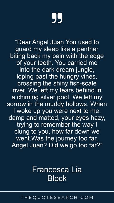 “Dear Angel Juan,You used to guard my sleep like a panther biting back my pain with the edge of your teeth. You carried me into the dark dream jungle, loping past the hungry vines, crossing the shiny fish-scale river. We left my tears behind in a chiming silver pool. We left my sorrow in the muddy hollows. When I woke up you were next to me, damp and matted, your eyes hazy, trying to remember the way I clung to you, how far down we went.Was the journey too far, Angel Juan? Did we go too far?”