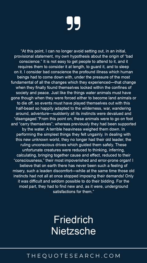“At this point, I can no longer avoid setting out, in an initial, provisional statement, my own hypothesis about the origin of “bad conscience.” It is not easy to get people to attend to it, and it requires them to consider it at length, to guard it, and to sleep on it. I consider bad conscience the profound illness which human beings had to come down with, under the pressure of the most fundamental of all the changes which they experienced—that change when they finally found themselves locked within the confines of society and peace. Just like the things water animals must have gone though when they were forced either to become land animals or to die off, so events must have played themselves out with this half-beast so happily adapted to the wilderness, war, wandering around, adventure—suddenly all its instincts were devalued and “disengaged.”From this point on, these animals were to go on foot and “carry themselves”; whereas previously they had been supported by the water. A terrible heaviness weighed them down. In performing the simplest things they felt ungainly. In dealing with this new unknown world, they no longer had their old leader, the ruling unconscious drives which guided them safely. These unfortunate creatures were reduced to thinking, inferring, calculating, bringing together cause and effect, reduced to their “consciousness,” their most impoverished and error-prone organ! I believe that on earth there has never been such a feeling of misery, such a leaden discomfort—while at the same time those old instincts had not all at once stopped imposing their demands! Only it was difficult and seldom possible to do their bidding. For the most part, they had to find new and, as it were, underground satisfactions for them.”