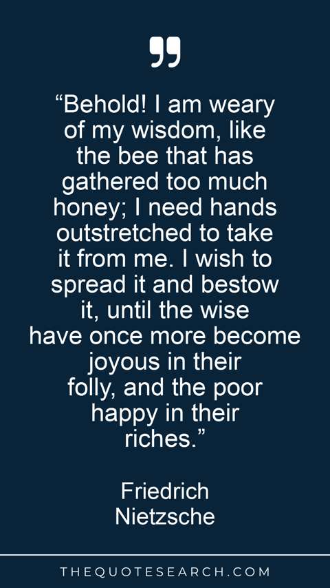 “Behold! I am weary of my wisdom, like the bee that has gathered too much honey; I need hands outstretched to take it from me. I wish to spread it and bestow it, until the wise have once more become joyous in their folly, and the poor happy in their riches.”