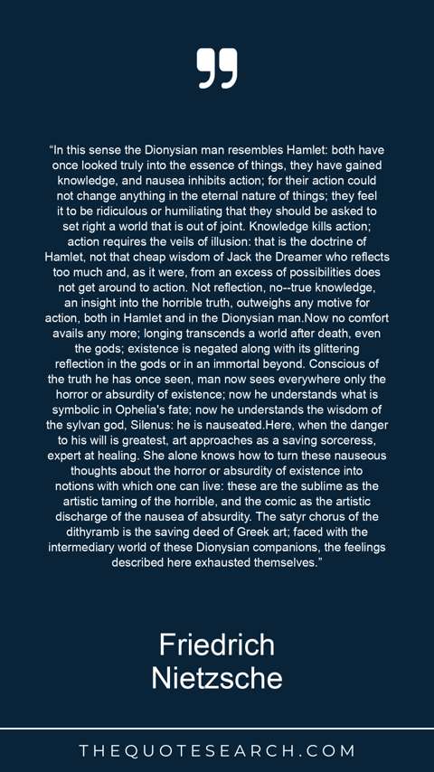 “In this sense the Dionysian man resembles Hamlet: both have once looked truly into the essence of things, they have gained knowledge, and nausea inhibits action; for their action could not change anything in the eternal nature of things; they feel it to be ridiculous or humiliating that they should be asked to set right a world that is out of joint. Knowledge kills action; action requires the veils of illusion: that is the doctrine of Hamlet, not that cheap wisdom of Jack the Dreamer who reflects too much and, as it were, from an excess of possibilities does not get around to action. Not reflection, no--true knowledge, an insight into the horrible truth, outweighs any motive for action, both in Hamlet and in the Dionysian man.Now no comfort avails any more; longing transcends a world after death, even the gods; existence is negated along with its glittering reflection in the gods or in an immortal beyond. Conscious of the truth he has once seen, man now sees everywhere only the horror or absurdity of existence; now he understands what is symbolic in Ophelia's fate; now he understands the wisdom of the sylvan god, Silenus: he is nauseated.Here, when the danger to his will is greatest, art approaches as a saving sorceress, expert at healing. She alone knows how to turn these nauseous thoughts about the horror or absurdity of existence into notions with which one can live: these are the sublime as the artistic taming of the horrible, and the comic as the artistic discharge of the nausea of absurdity. The satyr chorus of the dithyramb is the saving deed of Greek art; faced with the intermediary world of these Dionysian companions, the feelings described here exhausted themselves.”