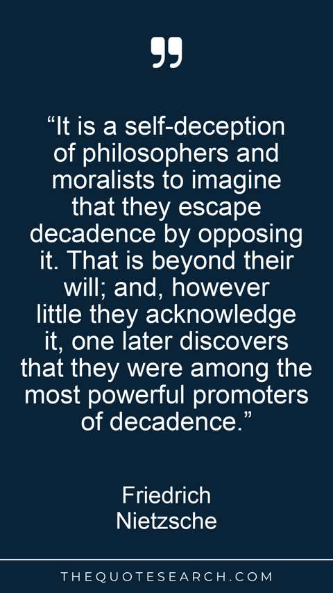 “It is a self-deception of philosophers and moralists to imagine that they escape decadence by opposing it. That is beyond their will; and, however little they acknowledge it, one later discovers that they were among the most powerful promoters of decadence.”