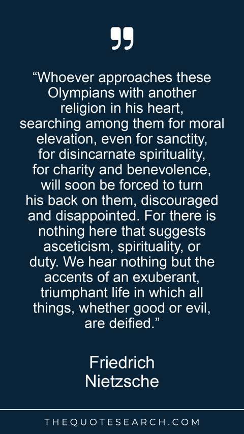 “Whoever approaches these Olympians with another religion in his heart, searching among them for moral elevation, even for sanctity, for disincarnate spirituality, for charity and benevolence, will soon be forced to turn his back on them, discouraged and disappointed. For there is nothing here that suggests asceticism, spirituality, or duty. We hear nothing but the accents of an exuberant, triumphant life in which all things, whether good or evil, are deified.”