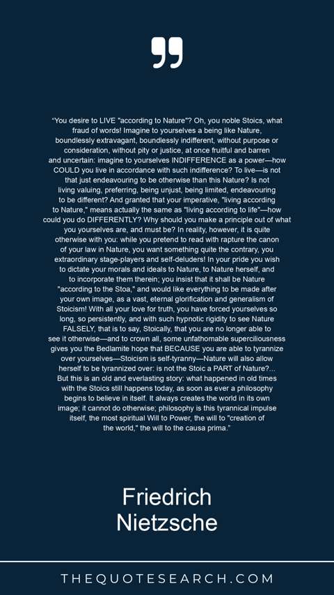 “You desire to LIVE "according to Nature"? Oh, you noble Stoics, what fraud of words! Imagine to yourselves a being like Nature, boundlessly extravagant, boundlessly indifferent, without purpose or consideration, without pity or justice, at once fruitful and barren and uncertain: imagine to yourselves INDIFFERENCE as a power—how COULD you live in accordance with such indifference? To live—is not that just endeavouring to be otherwise than this Nature? Is not living valuing, preferring, being unjust, being limited, endeavouring to be different? And granted that your imperative, "living according to Nature," means actually the same as "living according to life"—how could you do DIFFERENTLY? Why should you make a principle out of what you yourselves are, and must be? In reality, however, it is quite otherwise with you: while you pretend to read with rapture the canon of your law in Nature, you want something quite the contrary, you extraordinary stage-players and self-deluders! In your pride you wish to dictate your morals and ideals to Nature, to Nature herself, and to incorporate them therein; you insist that it shall be Nature "according to the Stoa," and would like everything to be made after your own image, as a vast, eternal glorification and generalism of Stoicism! With all your love for truth, you have forced yourselves so long, so persistently, and with such hypnotic rigidity to see Nature FALSELY, that is to say, Stoically, that you are no longer able to see it otherwise—and to crown all, some unfathomable superciliousness gives you the Bedlamite hope that BECAUSE you are able to tyrannize over yourselves—Stoicism is self-tyranny—Nature will also allow herself to be tyrannized over: is not the Stoic a PART of Nature?... But this is an old and everlasting story: what happened in old times with the Stoics still happens today, as soon as ever a philosophy begins to believe in itself. It always creates the world in its own image; it cannot do otherwise; philosophy is this tyrannical impulse itself, the most spiritual Will to Power, the will to "creation of the world," the will to the causa prima.”