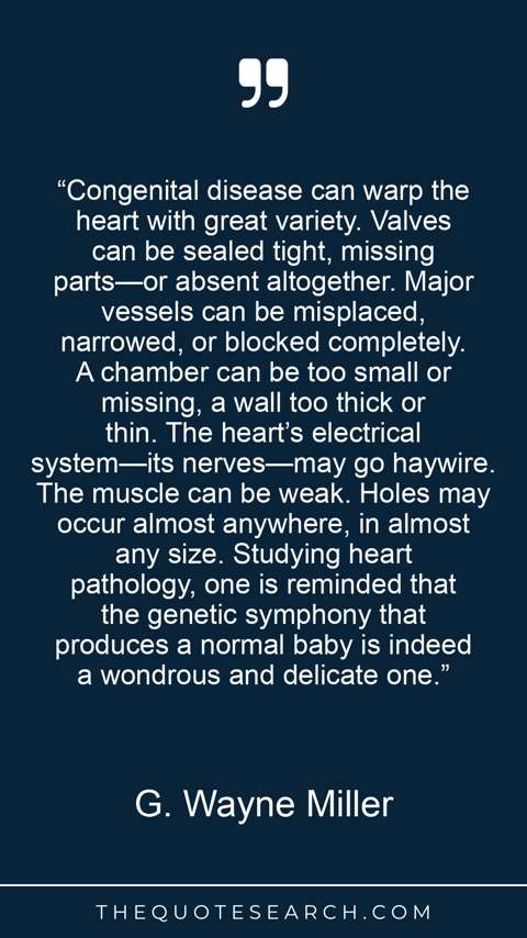 “Congenital disease can warp the heart with great variety. Valves can be sealed tight, missing parts—or absent altogether. Major vessels can be misplaced, narrowed, or blocked completely. A chamber can be too small or missing, a wall too thick or thin. The heart’s electrical system—its nerves—may go haywire. The muscle can be weak. Holes may occur almost anywhere, in almost any size. Studying heart pathology, one is reminded that the genetic symphony that produces a normal baby is indeed a wondrous and delicate one.”