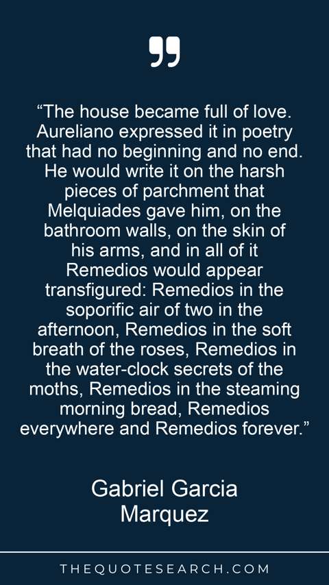 “The house became full of love. Aureliano expressed it in poetry that had no beginning and no end. He would write it on the harsh pieces of parchment that Melquiades gave him, on the bathroom walls, on the skin of his arms, and in all of it Remedios would appear transfigured: Remedios in the soporific air of two in the afternoon, Remedios in the soft breath of the roses, Remedios in the water-clock secrets of the moths, Remedios in the steaming morning bread, Remedios everywhere and Remedios forever.”